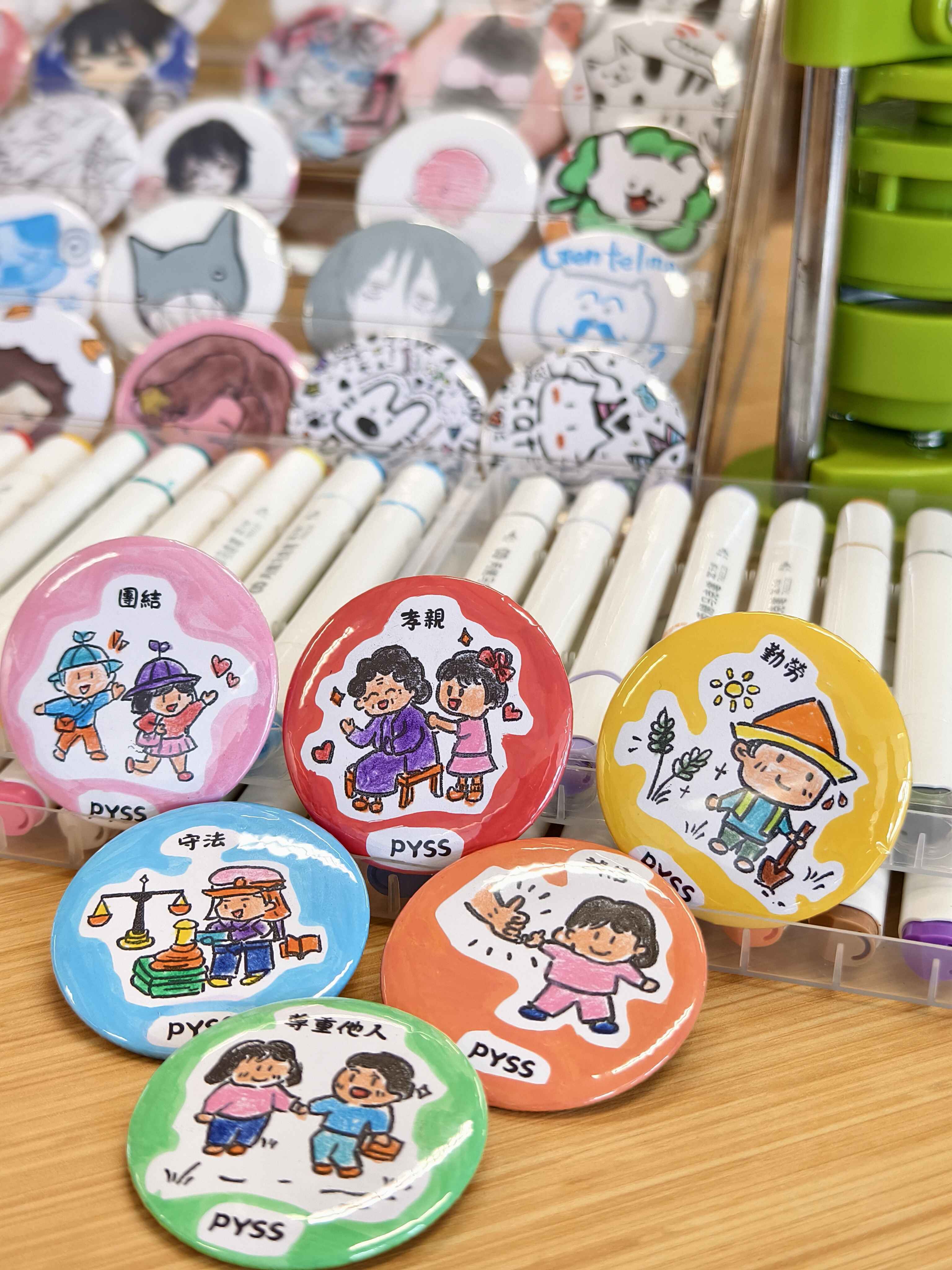 而3樓的藝術室裡,我校的「藝術大使」帶領參訪者欣賞同學的畫作及作品,青春的創意與巧思,讓現場讚歎聲連連。當天更有徽章製作體驗,來賓可以親手製作屬於自己的徽章,將活動記憶化為可攜帶的紀念品。