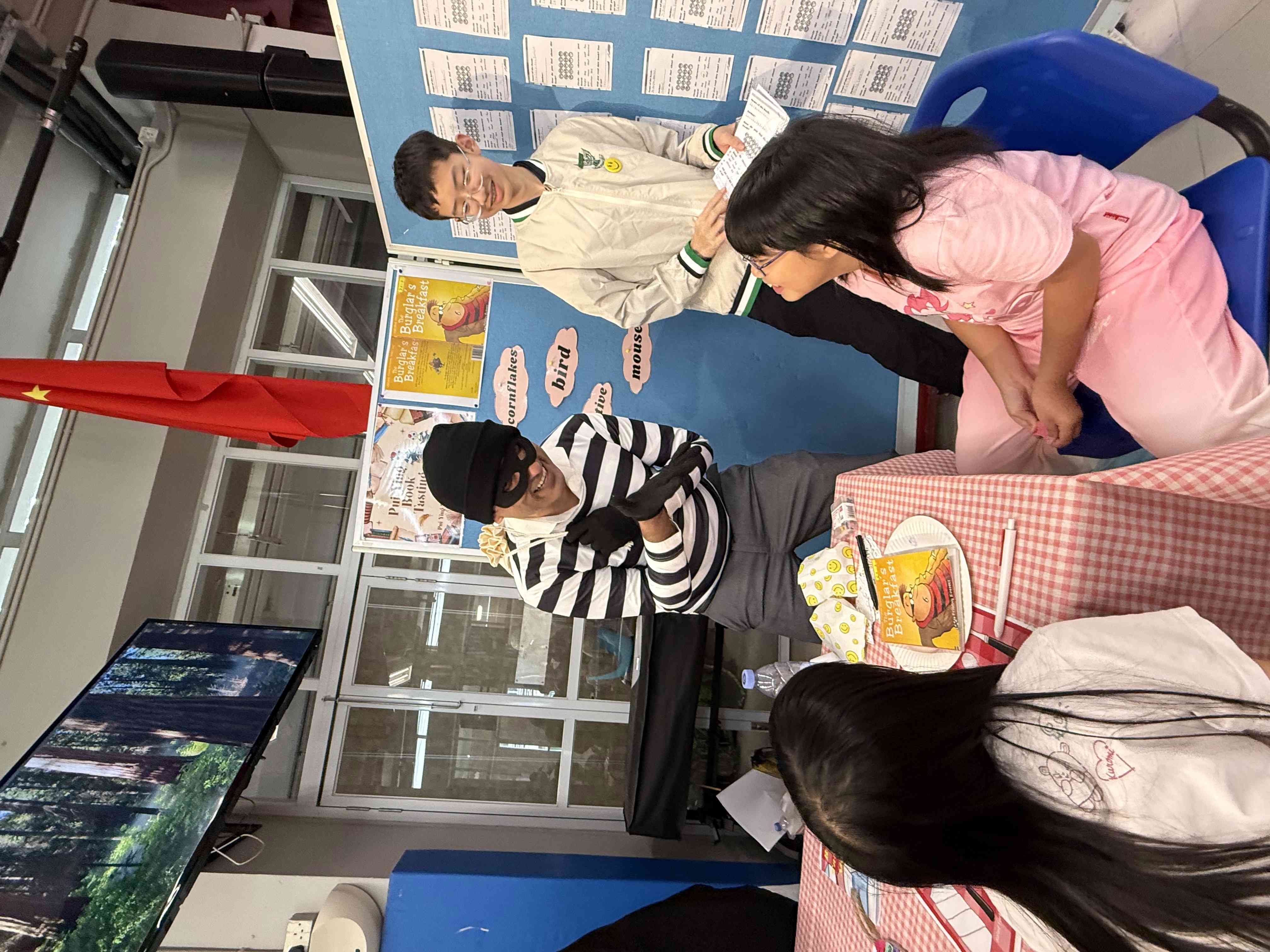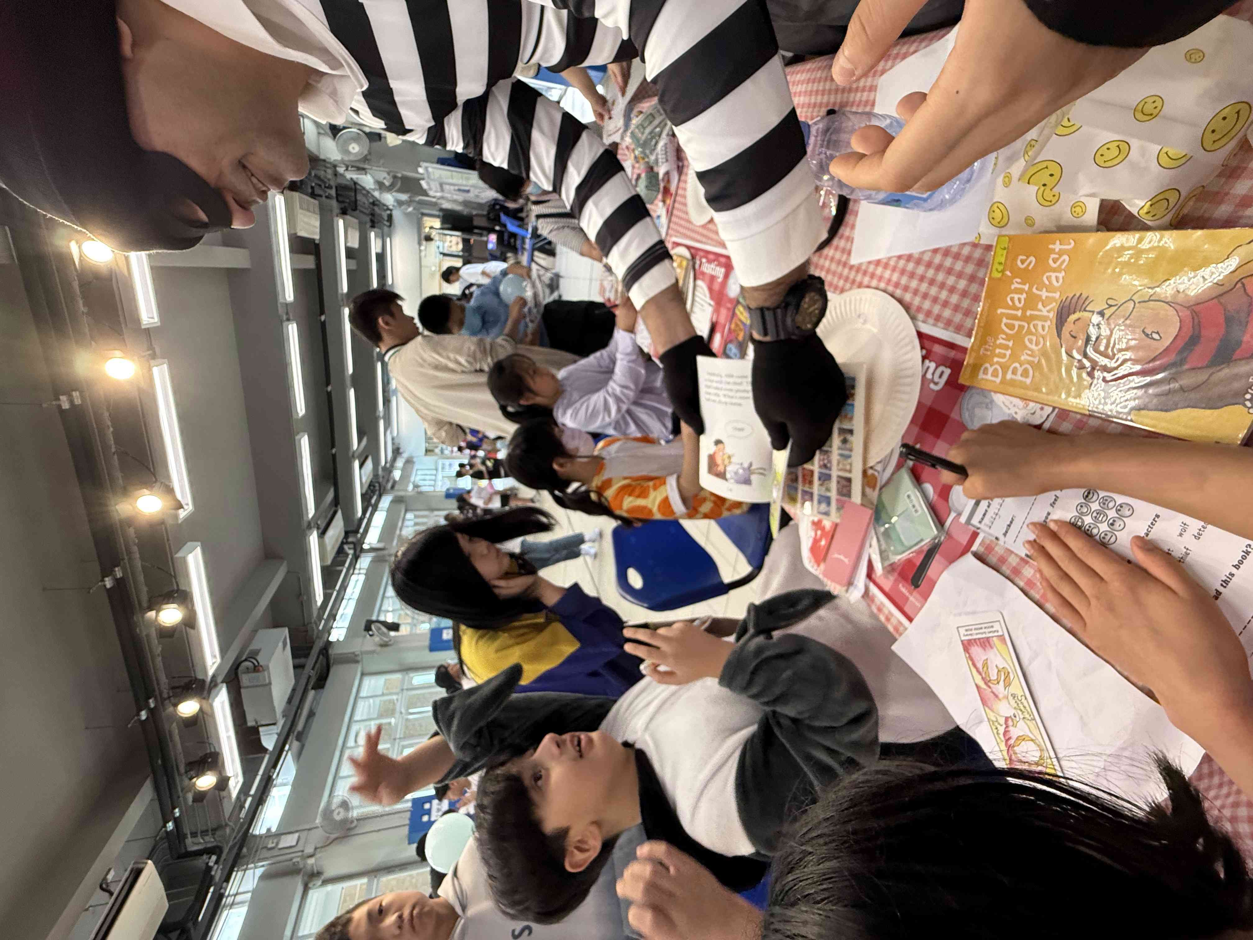 Teachers and students turned the booth into a dining table, inviting young students to "taste" a book. The featured book was The Burglar's Breakfast, one of our teachers dressed up as a burglar and did a lively storytelling session. Primary school students were immersed in the story by flipping through the book, listening to the story, and interacting with the character.